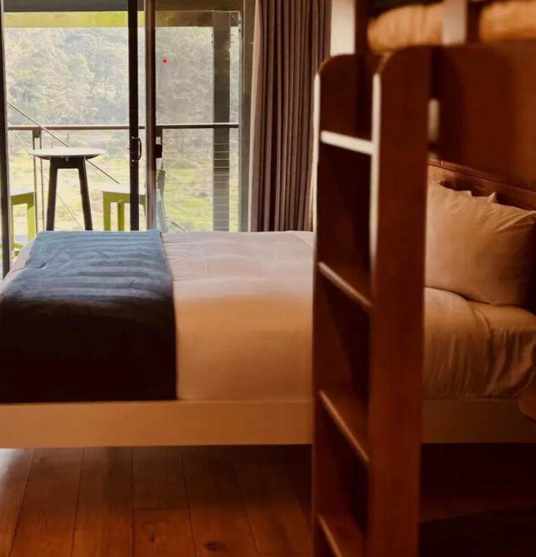 Thoughtfully designed for you and your Field Trip friends, this inviting room features a plush queen bed and a hand-crafted bunk bed to comfortably sleep up to four guests. Gather around the in-room table for board games or step out onto your private balcony or patio to take serene views of the cove. A cozy fireplace and curated vinyl collection set the tone for relaxed evenings together filled with comfort, connection, and unforgettable memories. This room includes flat screen television, wireless internet, mini refrigerator, Crosley LP record player, organic toiletries, Steep coffee and tea, yoga mat, safe, and hairdryer.